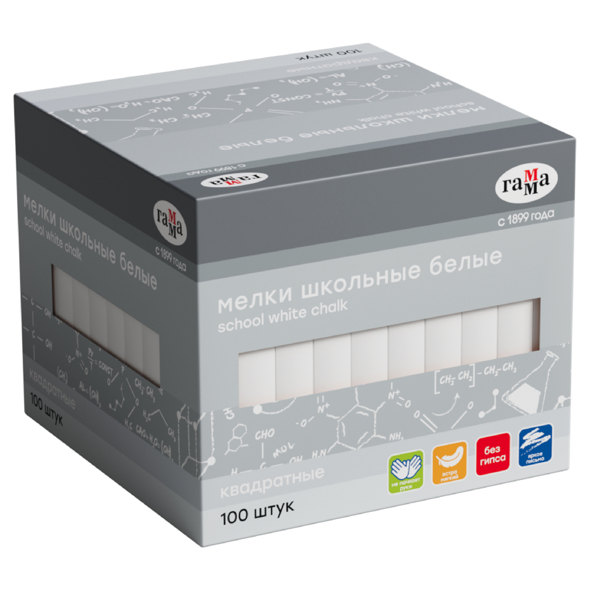 Мел удобно лежит в руке, не царапает рабочую поверхность и не создаёт пыль. Продукт на 95 % состоит из чистого мела, не содержит гипс. Экономично расходуется и одного набора хватает надолго. Упакован в картонную коробку