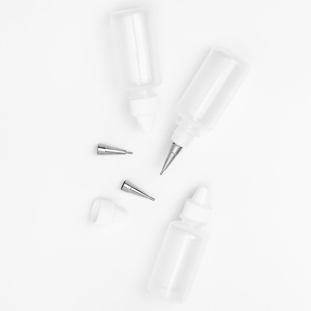В наборе 3 пластиковых прозрачных тюбика с крышкой и 3 вида наконечников разной толщины.
