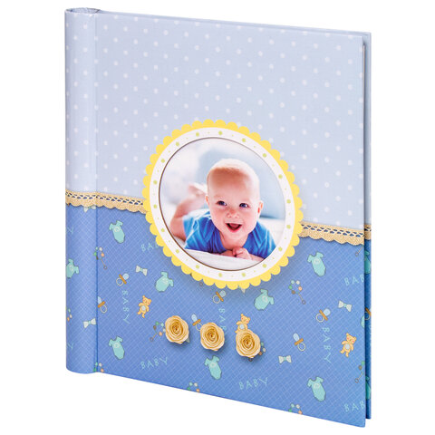 Состоит из 20 магнитных листов размером 23х28 см, что позволяет комбинировать и размещать до 120 фотографий различных форматов: 18х24 см, 10х15 см, 13х18 см. Обложка фотоальбома выполнена в детском стиле, в бежево-синих тонах и декорирована рамкой для фотографии которую можно заменить по желанию владельца. Способ крепления страниц - спираль. Размер - 29х25 см.