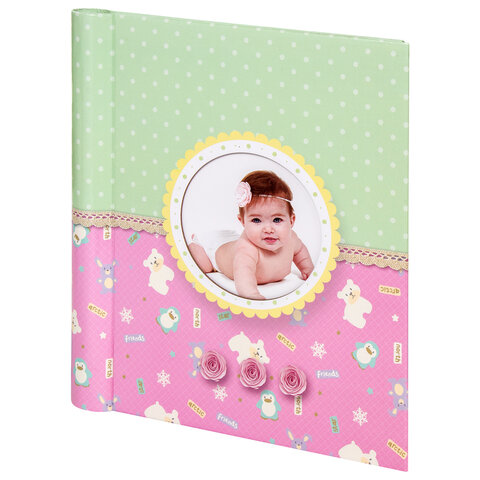 Состоит из 20 магнитных листов размером 23х28 см, что позволяет комбинировать и размещать до 120 фотографий различных форматов: 18х24 см, 10х15 см, 13х18 см. Обложка фотоальбома выполнена в детском дизайне в салатовом и розовом тонах и декорирована фоторамкой, фотография в которой может быть заменена по желанию владельца. Способ крепления страниц - спираль. Размер альбома - 25х29 см.