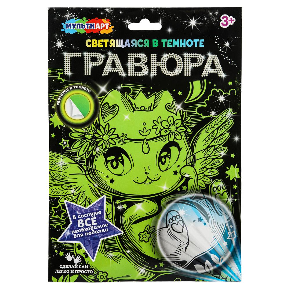 С помощью данного набора юный художник сможет создать эффектную картину на чёрном фоне, которая загадочно светится в темноте. Контур рисунка уже нанесён на основу, остаётся только процарапать изображение специальным штихелем. Можно не повторять каждую черточку, главное — соблюдать направление штриха! Готовая поделка станет отличным вариантом для подарка близким или для украшения интерьера комнаты.