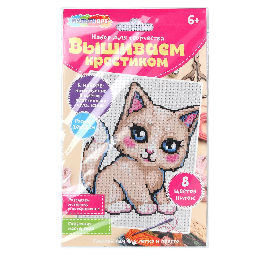 При помощи этого набора, маленький художник сможет создать красивую вышивку с изображением очаровательной кошечки. В целях безопасности игла из набора изготовлена из пластика и специально затуплена. Яркую поделку можно вставить в рамку и подарить близким или использовать для украшения комнаты.
